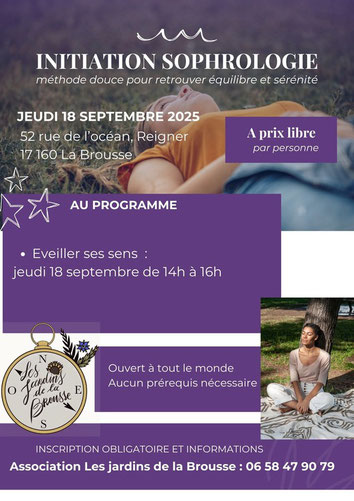 Rendez-vous au 52 Rue de l’Océan, 17160 La Brousse, le 18 septembre de 14h à 16h. Prix libre et conscient (libre ne veut pas dire gratuit, pour avoir une idée des tarifs, prévoir à partir de 10